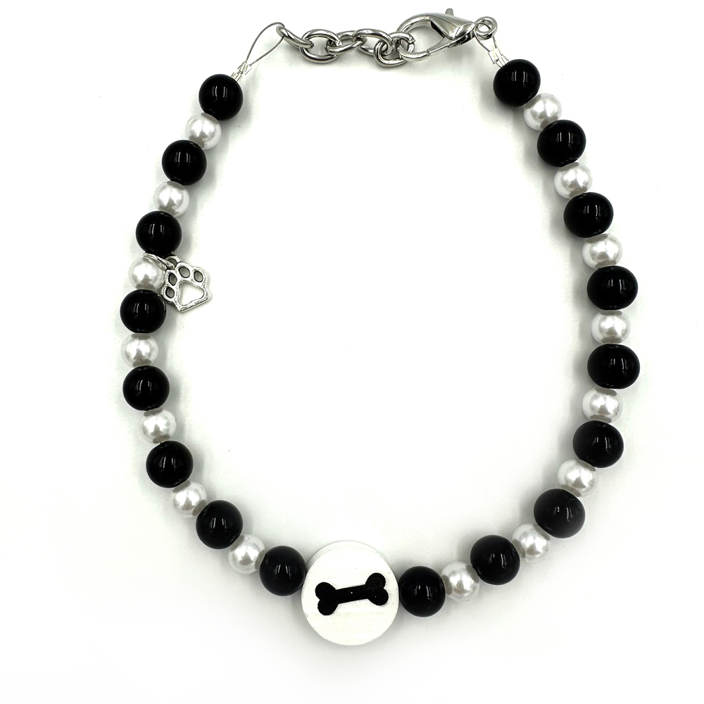 Κολιέ με μαύρη χάντρα 10mm, λευκή πέρλα 8mm, μεταλλικό και ξύλινο στοιχείο.