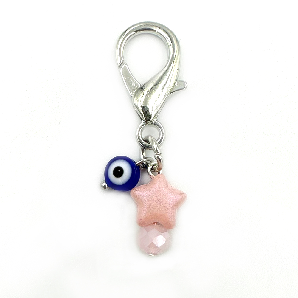 Μπλέ ματάκι με μοτίφ σε ρόζ χρώμα και ρόζ χάντρα